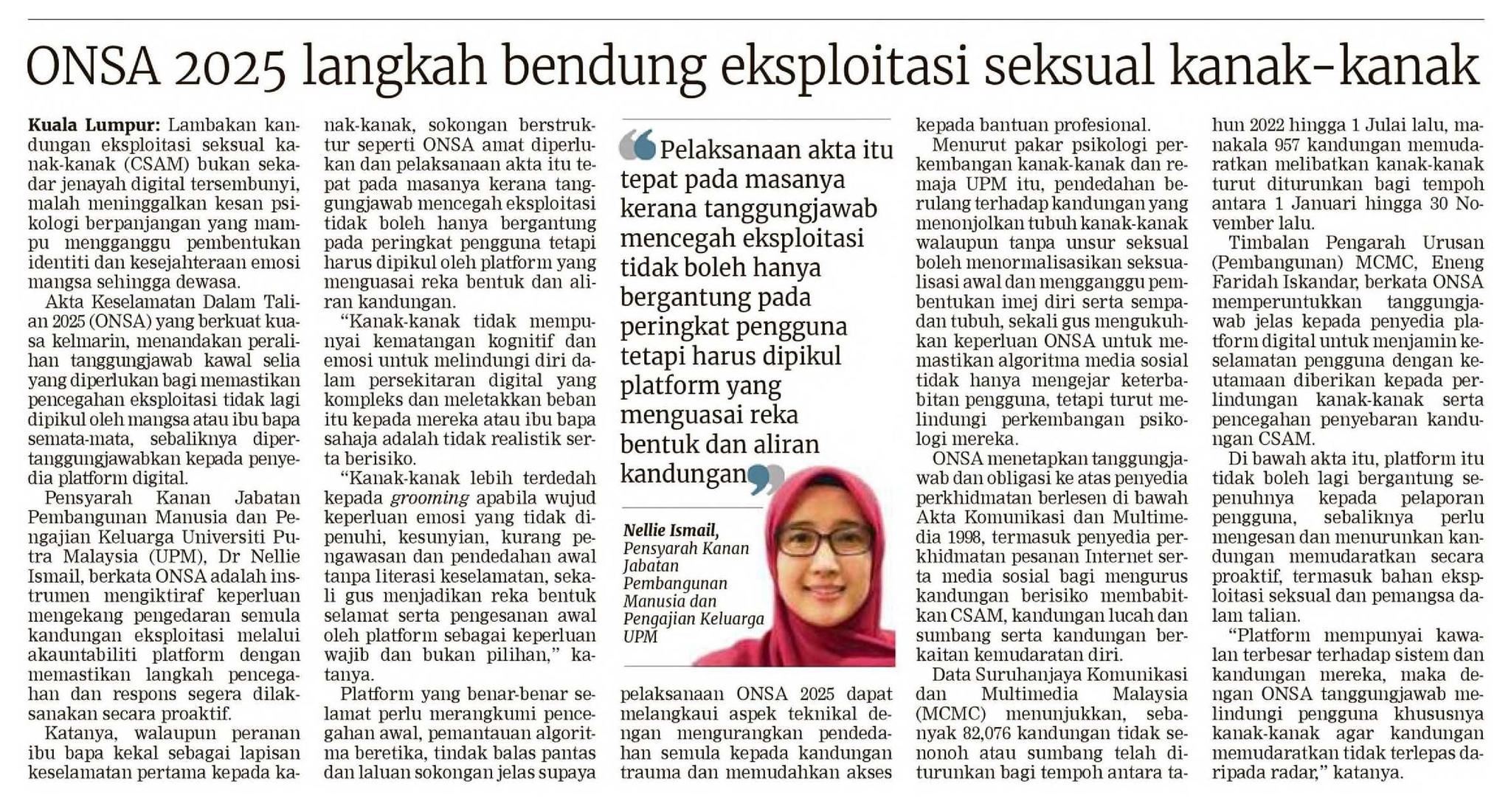 Keratan Akhbar Berita Harian, Langkah Bendung Eksploitasi Seksual Kanak-Kanak – 3 Januari 2026